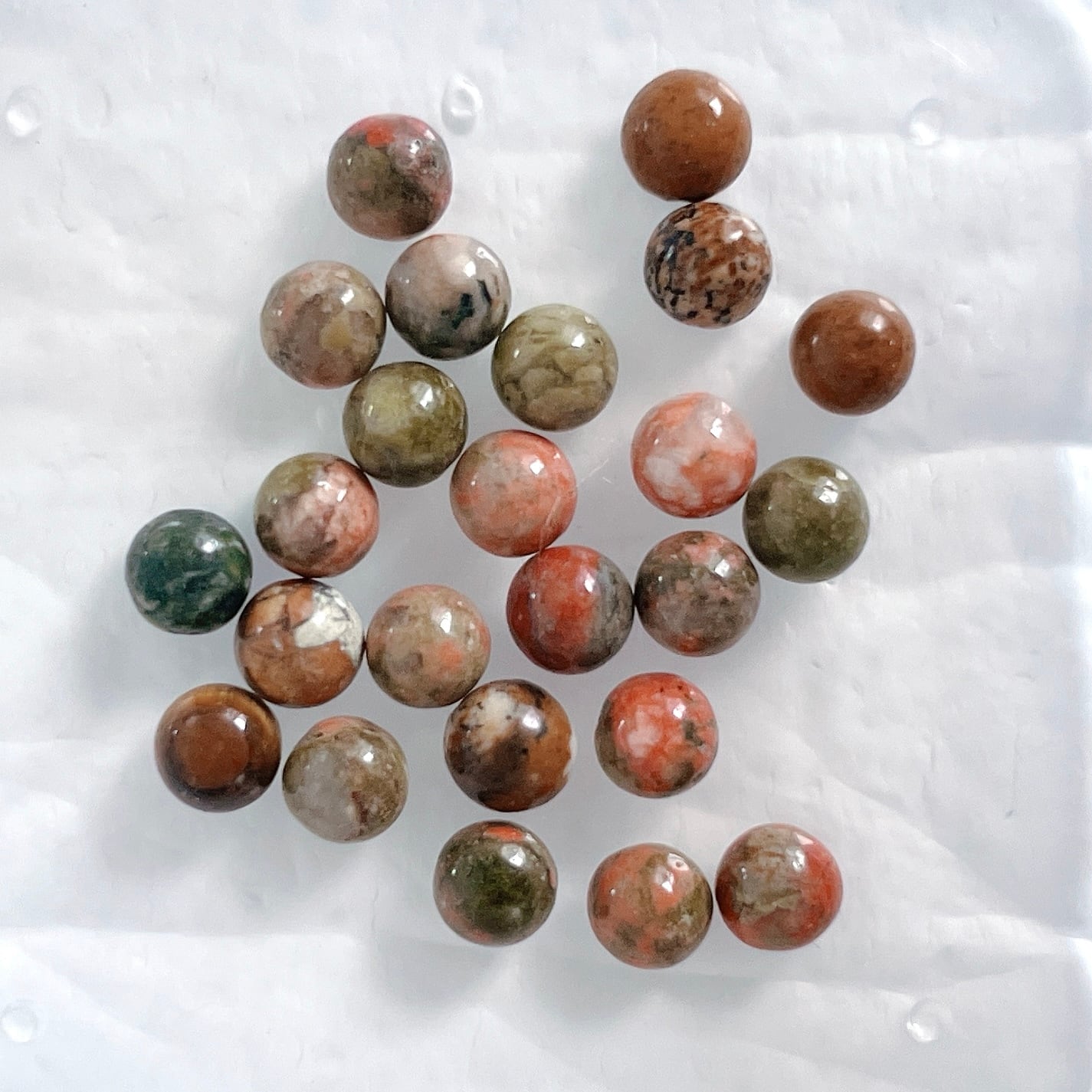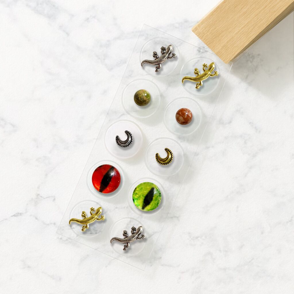 トカゲの魅力をぎゅっと詰め込んだ10粒のセットです。トカゲカラーのユナカイトが放つ自然な色合いと、爬虫類の目玉を思わせるモチーフが印象的。